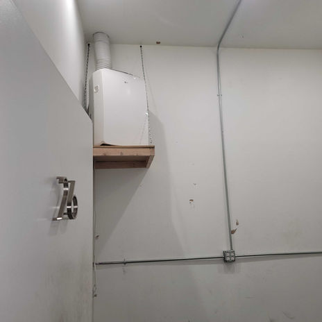 Individual/portable AC unit, multiple heavy quad power outlets on wall.
